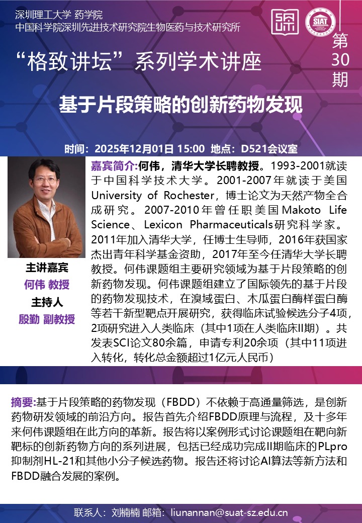 【“格致讲坛”系列学术讲座第30期】基于片段策略的创新药物发现
