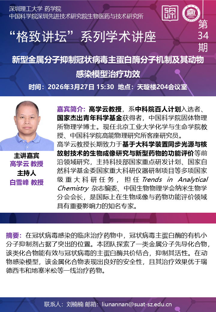 【“格致讲坛”系列学术讲座第34期】新型金属分子抑制冠状病毒主蛋白酶分子机制及其动物感染模型治疗功效
